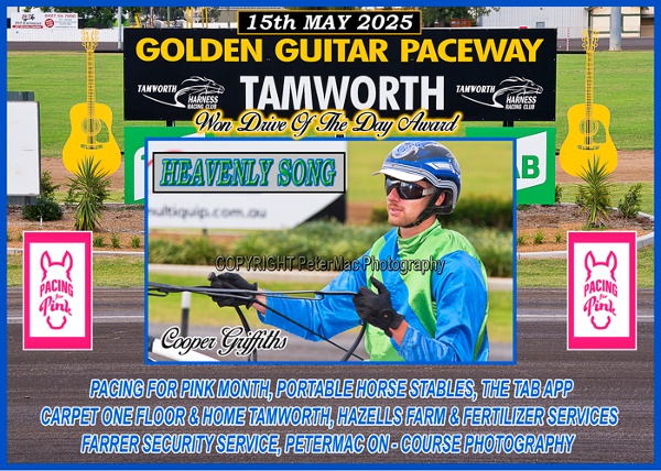 THE PUB DRIVE OF THE DAY: was won by COOPER GRIFFITHS driving Heavenly Song from the Warral stables of Tom Ison in Race 4 the Portable Horse Stables Pace. COOPER receives a $30.00 Meal Voucher courtesy of sponsor The Pub, Gunnedah Rd Tamworth.