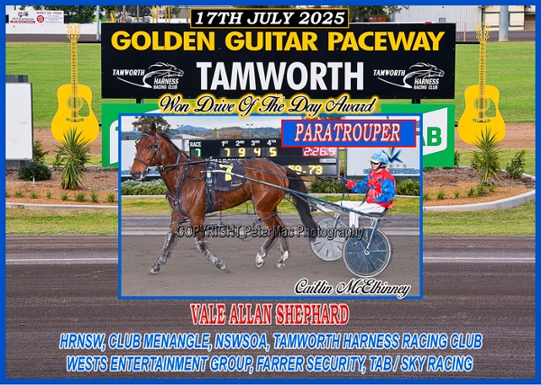 THE PUB DRIVE OF THE DAY: was won by CAITLIN McELHINNEY driving Paratrouper from Tamworth Stables of Jamie Donovan in Race 7 the Wests Entertainment Group Pace. CAITLIN receives a $30.00 Meal Voucher courtesy of sponsor The Pub, Gunnedah Rd Tamworth.