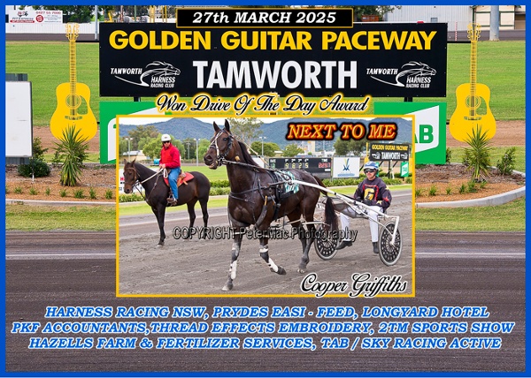 THE PUB DRIVE OF THE DAY: was won by COOPER GRIFFITHS driving Next To Me from the East Maitland stables of Keith McDeed in Race 3 the PKF Accountants Pace. COOPER receives a $30.00 Meal Voucher courtesy of sponsor The Pub, Gunnedah Rd Tamworth.