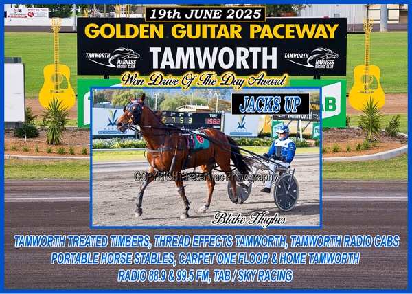THE PUB DRIVE OF THE DAY: was won by BLAKE HUGHES driving Jacks Up from the Pokoblin stables of Grace Panella in Race 3 the Thread Effects - Embroidery Service Tamworth Pace. BLAKE receives a $30.00 Meal Voucher courtesy of sponsor The Pub, Gunnedah Rd Tamworth.