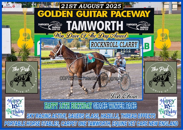 THE PUB DRIVE OF THE DAY: was won by JOSH OSBORN driving Rocknroll Clarry from his family's Maitland Stables in Race 5 the The Portable Horse Stables - Tamworth Pace. JOSH receives a $30.00 Meal Voucher courtesy of sponsor The Pub, Gunnedah Rd Tamworth.