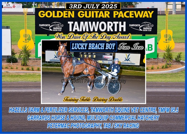 THE PUB DRIVE OF THE DAY: was won by TOM ISON driving Lucky Beach Boy from his own Warral stables in Race 7 the Multiquip Commercial Hatchery Pace. TOM receives a $30.00 Meal Voucher courtesy of sponsor The Pub, Gunnedah Rd Tamworth.